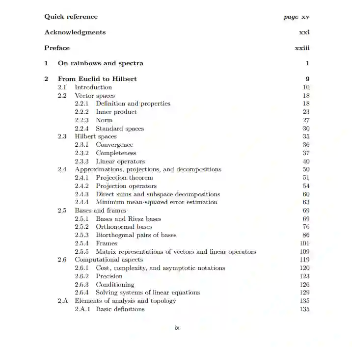 这本书涵盖了现代信号处理的深入理解的基础。它包含了许多读者以前可能看到的分散在多个来源的材料,但没有希尔伯特空间解释,这在信号处理中是必不可少的。我们的目标是用几何来教授信号处理,也就是说,将欧几里得几何观点扩展到抽象信号;我们用希尔伯特空间几何来完成。通过这种方法,基本概念——如基的性质、傅里叶表示、采样、插值、逼近和压缩——通常在有限维度、离散时间和连续时间中统一起来,从而更容易指出少数的本质区别。几何上统一结果有助于推广到傅里叶域以外的见解,推动理解得更远、更快。