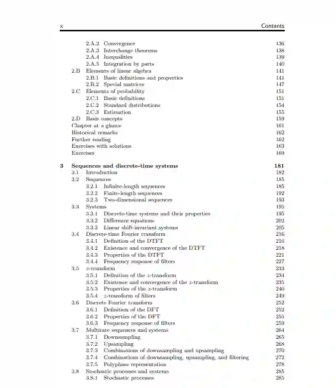 在第3章“序列与离散时间系统”中,向量是依赖于离散时间的序列,在这些向量上的一类重要的线性算子是对时移不变的算子;这些是卷积算子。这些运算符自然地导致使用离散时间傅里叶变换的信号表示,而对于循环扩展的有限长度序列,则使用离散傅里叶变换。