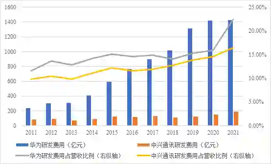 图3:华为VS.中兴通讯(研发费用&研发费用占营收比例)