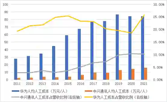 注:中兴通讯披露口径为应付职工成本(包含工资、奖金、津贴、职工福利费、社会保险费、住房公积金等),与人工成本近似。