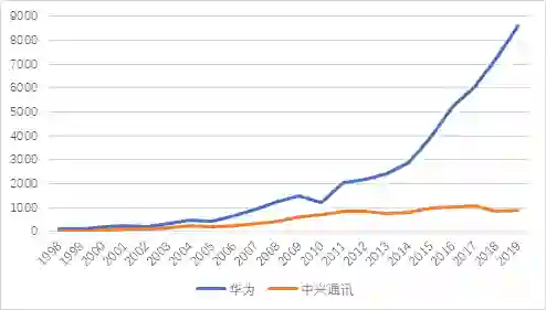 而在1998年之后,华为才开始真正起飞,与中兴通讯之间逐渐形成了量级差异。到了2019年,华为的营收已达到中兴通讯9.5倍之多。