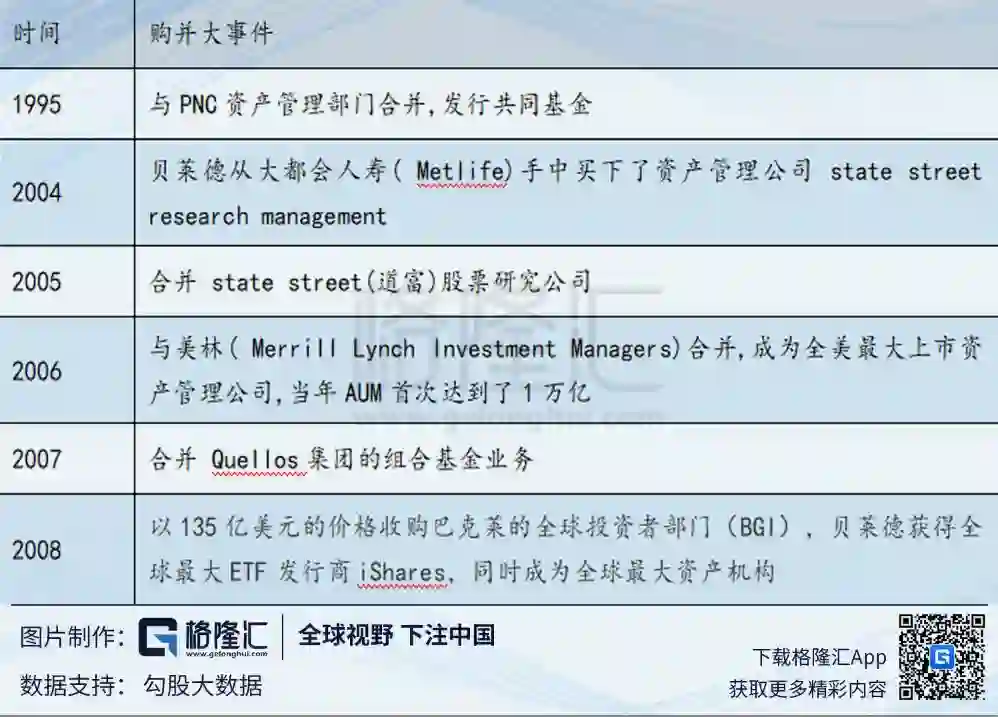 贝莱德成立于1988年,经历过几次重大的购并后,已经成长为全球最大的公募资产管理公司。贝莱德通过部署于约30个国家的13000位员工,为100多个国家的个人、政府、雇主、保险公司提供跨越股票、固定收益投资、现金管理、替代性投资、不动产及咨询策略等五大类的产品架构的服务。