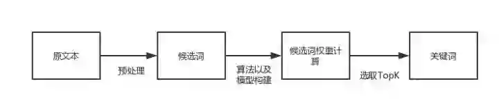 有监督的文本关键词提取算法需要高昂的人工成本,因此现有的文本关键词提取主要采用适用性较强的无监督关键词抽取。其文本关键词抽取流程如下: