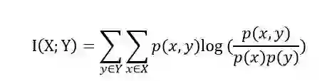 互信息是信息论中概念,是变量之间相互依赖的度量。互信息并不局限于实值随机变量,它更加一般且决定着联合分布 p(X,Y) 和分解的边缘分布的乘积 p(X)p(Y) 的相似程度。互信息的计算公式如下: