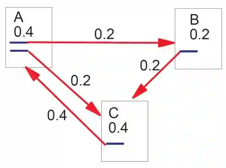 在PageRank算法中,最主要的是对于初始网页重要性(PR值)的计算,因为对于上图中的网页A的重要性我们是无法预知的。但是,在原始论文中给出了一种迭代方法求出这个重要性,论文中指出,幂法求矩阵特征值与矩阵的初始值无关。那么,就可以为每个网页随机给一个初始值,然后迭代得到收敛值,并且收敛值与初始值无关。