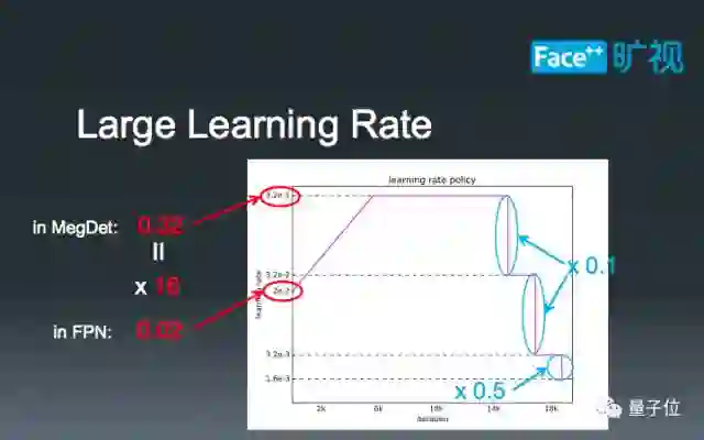 介绍一些在大Batch-Size下的学习率调参技巧。16-batch的FPN标准学习率是0.02, 而我们的MegDet的Batch-Size是256。在这种情况下,我们如果直接设定学习率为0.32=0.02 x 16,会导致模型早期迅速发散,无法完成训练。因此,我们需要有一个“逐步预热”的过程,让模型逐渐适应较大的学习率。当训练到一定阶段的时候,我们设定了三个下降阶段:在前两个阶段,我们直接将学习率除以10,最后再将学习率减半。这种学习率的设计主要是为了在比赛中取得极致性能,也是我们的经验所得。