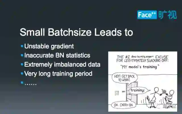 但在COCO Detection任务中,我们发现人们使用的BatchSize非常小。最开始的只有2,相当于是两张卡,一张卡一张图;到后面的一些版本,BatchSize也仅有8,就是8张卡训练,一张图一张卡;最新一些研究的结果会达到16,这个结果跟Classification任务相比,连零头都不到。