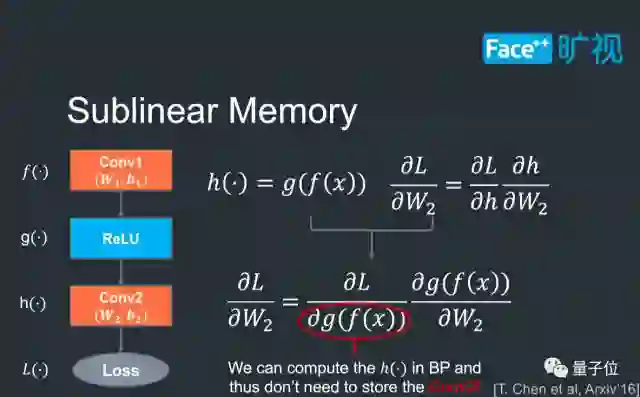 Sublinear Memory技术。这项技术的目的在于减少深度卷积神经网络的显存消耗量,保证我们在比赛之中可以尽可能地使用大模型。我们可以通过上图来简单地体会这项技术的作用。在现有训练方法中,为了计算Conv2中参数(W2, b2)的梯度,人们一般需要保存Conv2的输出结果;但实际上,Conv2的输出结果可以根据Conv1的结果来动态计算,这样Conv2的输出结果就不需要保存,显存消耗也能进一步下降;特别是一些非常深的神经网络,例如152层的模型,Sublinear Memory能显著降低显存的使用量,帮助我们尝试更多的技巧。