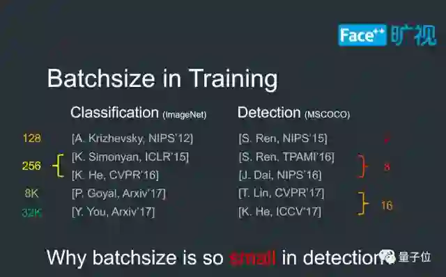 在COCO Detection比赛中,我们优先解决的是Batchsize的问题;回顾ImageNet Classification的工作,他们的Batchsize在训练过程中非常大,从起步开始就已经是128,最新的一些研究甚至达到了8000或者32K的水平,这使得人们可以在一个小时、乃至半个小时之内完成ImageNet的训练。