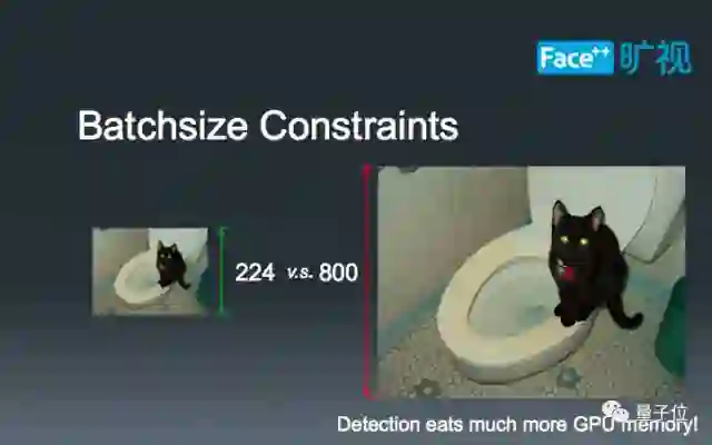 这个时候,我们就有了一个疑问:为什么在物体检测中Batchsize会这么小呢?要回答这个问题,我们需要了解物体检测和图像识别的不同之处。对于图像识别而言,算法只需要判断一张图中的主要物体,而主要物体所占像素比例通常较大,因此一张224x224的小图即可满足需求。 但是在物体检测里,人们往往需要检测一些精细的小物体,这些物体所占像素比例非常小,常常不足1%。而现有的神经网络技术一般会逐步缩小特征图的尺寸,为了保证小物体在最后的特征图上占有一定的比例,算法需要一张较大的输入图片,通常的做法是800x800。