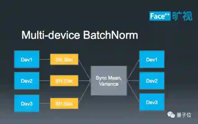 解决了BN统计不准确的问题。简单来讲,已有的BN统计方法局限于统计单张卡上的图片,做不到多张卡联合统计。由于物体检测本身的特性,单张卡上的图片数量达不到BN统计的要求,因此只能通过多卡联合统计来训练得到结果。为此,我们利用了NCCL(NVIDIA Collective Communications Library)代码库,实现了多卡BN。具体的算法流程可以参照上图,首先通过单卡自主统计BN的参数,再将参数发送到单张卡上进行合并,最后再把BN的结果同步到其他卡上,以进行下一步的训练。