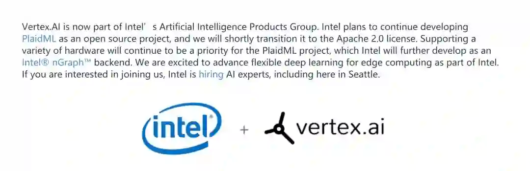 Vertex.AI 公司网站主页上的一则声明说,该公司日后将努力“支持多种硬件”,并计划将 PlaidML 与英特尔的 nGraph 机器学习后端进行整合。Vertex 同时表示,他们将继续开发 PlaidML,以将其作为 Apache 2.0 许可下的一个开源项目。