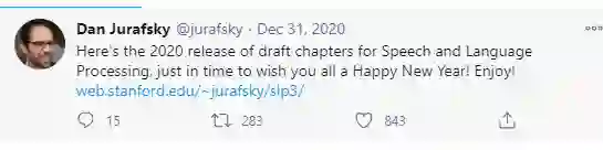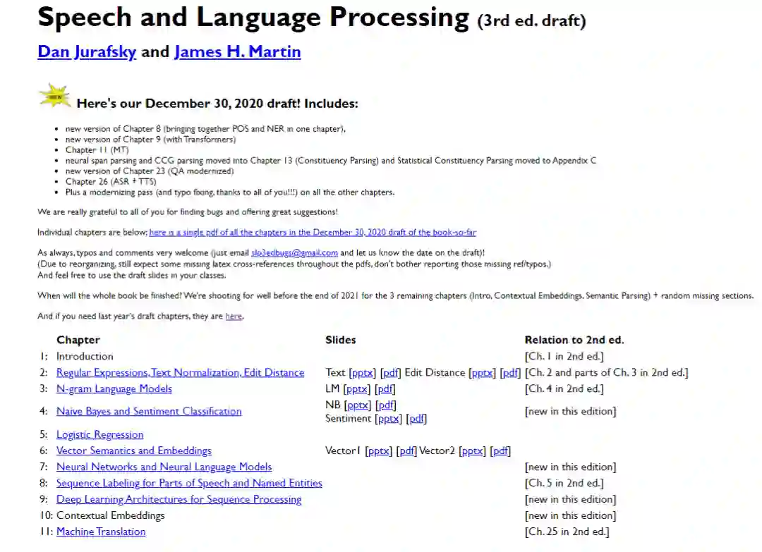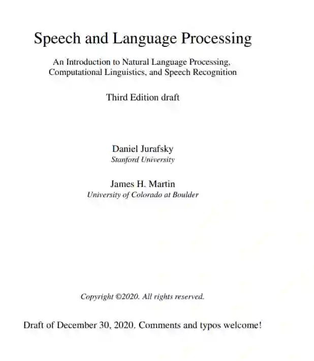 【导读】斯坦福大学教授 Dan Jurafsky 与科罗拉多大学波德分校 James H. Martin 教授共同撰写的《Speech and Language Processing》,被翻译成 60 多种语言,是全世界自然语言处理领域最经典的教科书。本书不仅可以作为高等学校自然语言处理和计算语言学等课程的本科生和研究生教材,对于自然语言处理相关领域的研究人员和技术人员也是不可或缺的权威参考书。