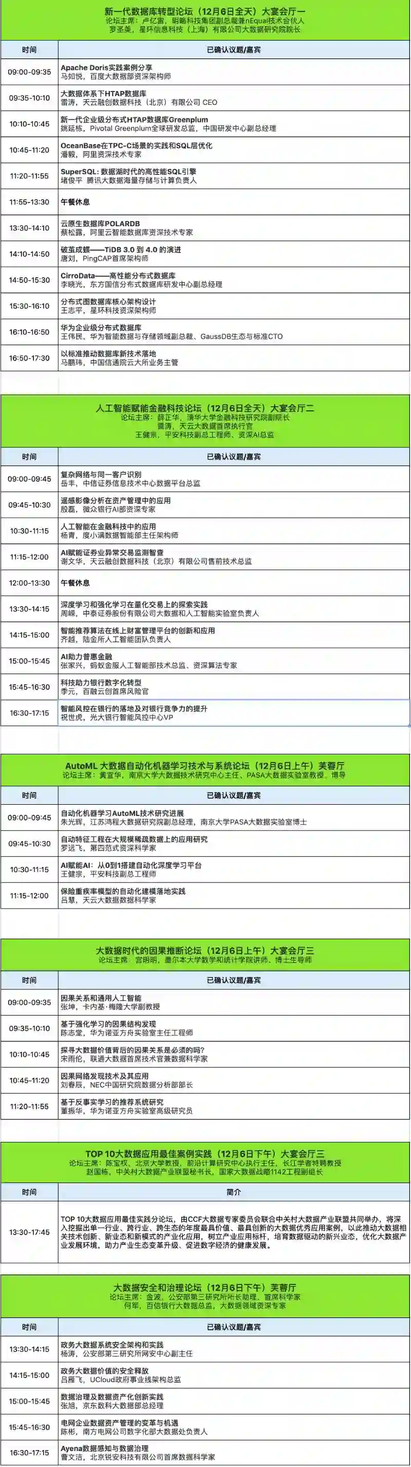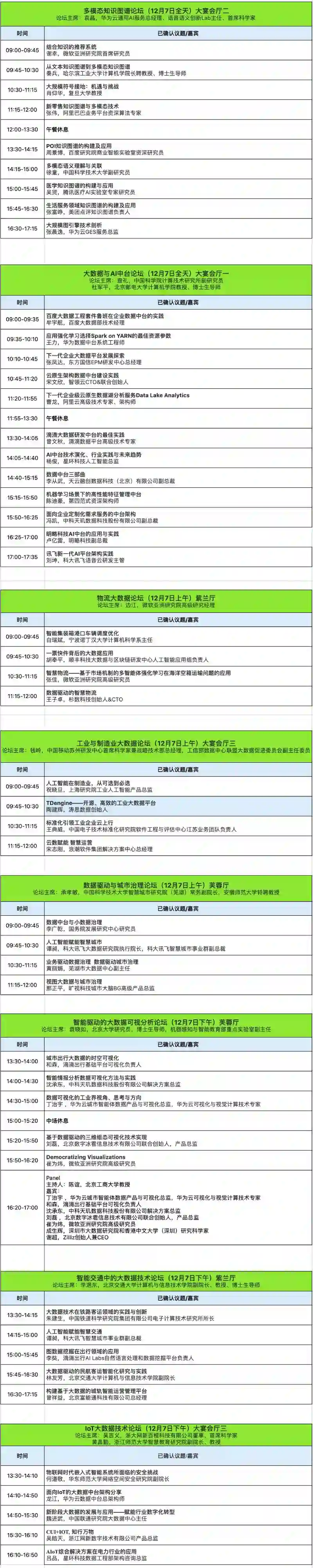12 月 6 日-7 日, 主办方精心策划了 14 场技术和行业论坛,包括新一代数据库转型、人工智能赋能金融科技、AutoML大数据自动化机器学习技术与系统、大数据时代的因果推断、大数据安全和治理、多模态知识图谱、大数据与AI中台、物流大数据、工业与制造业大数据、数据驱动与城市治理、智能驱动的大数据可视分析、IoT大数据技术、智能交通中的大数据技术、Top 10大数据应用最佳案例实践等主题多样化组合选择的空间,让参会者制定专属自己的参会攻略。