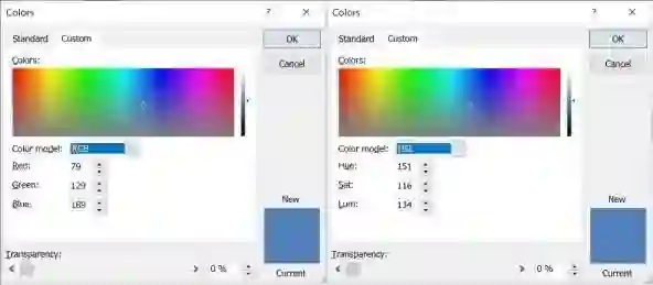 PowerPoint 使用 HSL 色彩空间。在色彩选择区,它们水平显示所有的色调,垂直显示饱和度。在 HSL 色彩空间中,饱和度为 0 是灰色的,因此完整的下边界是灰色的。右边是一个滚动条,可以改变亮度,0 表示黑色,128 表示灰色,255 表示白色(它不使用 0-100%,而是 0-255)。在 0 和 255 时,色调和饱和度失去了意义。最纯粹的色彩是在亮度 128。