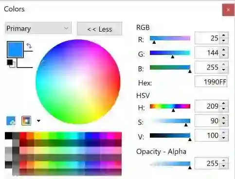 它的工作原理有点像 PowerPoint 中的取色器,但使用 HSV(HSB)代替,这意味着色彩区域的下部是白色的,而不是灰色的。下方的滚动条改变 V 值(亮度)。当设置为黑色时,色调和饱和度保持其最新值,即使后来在色彩区域选择了不同的色彩也一样。当值(亮度)增加时,色彩区的圆圈就会跳回原来的色调。这样很奇怪,但至少没有崩溃。