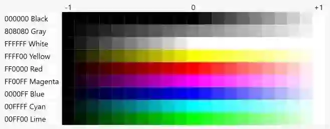 注意:对于灰色(即 R、G 和 B 有相同的值),色调和饱和度都没有定义,只有亮度有意义的值。我们也可以说,黑色、灰色和白色都不是色彩。黑色 0000 的亮度为 0,白色 FFFFF 的亮度为 1。仅靠亮度来控制白色、灰色和黑色的外观有一个奇怪的后果,我们可以在下一张图中看到。