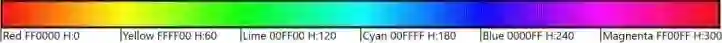 顺便说一下,这些是显示器可以生成的最亮的色彩,因为它们使用了 2 个全亮的点,而红、绿、蓝色只使用了 1 个点。对于其他所有色调,亮度第二强的点发出的亮度低于 255。正是这个既不是 255 也不是 0 的“中间”点定义了色调。将这个中间点的亮度从 0 缓慢递增到 255,我们可以得到比如说在红色(FF0000)和黄色(FFF00)之间的所有色调。总共有 6 种这样的转换: