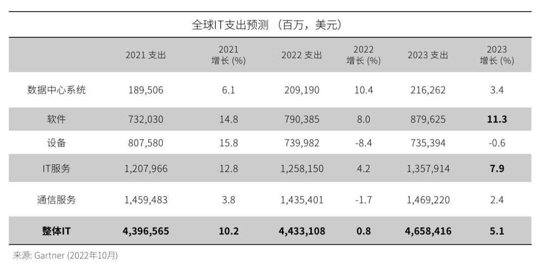 根据咨询公司Gartner此前发布的预测,2023年,全球IT支出将达到4.6万亿美元,相比2022年增加5.1%。这是IT支出复苏的显著征兆,要知道2022年相比2021年,同比增长只有0.8%。