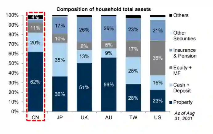全球主要市场居民财富配置比例,来源:高盛