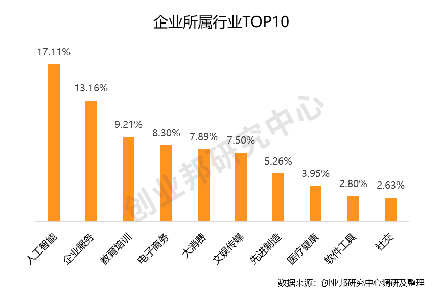 人工智能、企业服务为最多的创业领域,其次,教育培训、大消费等赛道紧随其后,热度不减。此外,先进制造、医疗健康等技术驱动行业因其行业壁垒高筑而显得炙手可热。