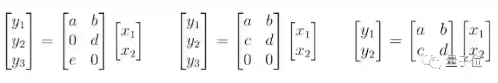 假设一个表示为矩阵乘法的神经网络层,该层具有 2 个输入(Xn),6 个权重(a, b, …, f)以及 3 个输出(Yn;神经元)。也就是说评估这一层需要 6 次乘法。