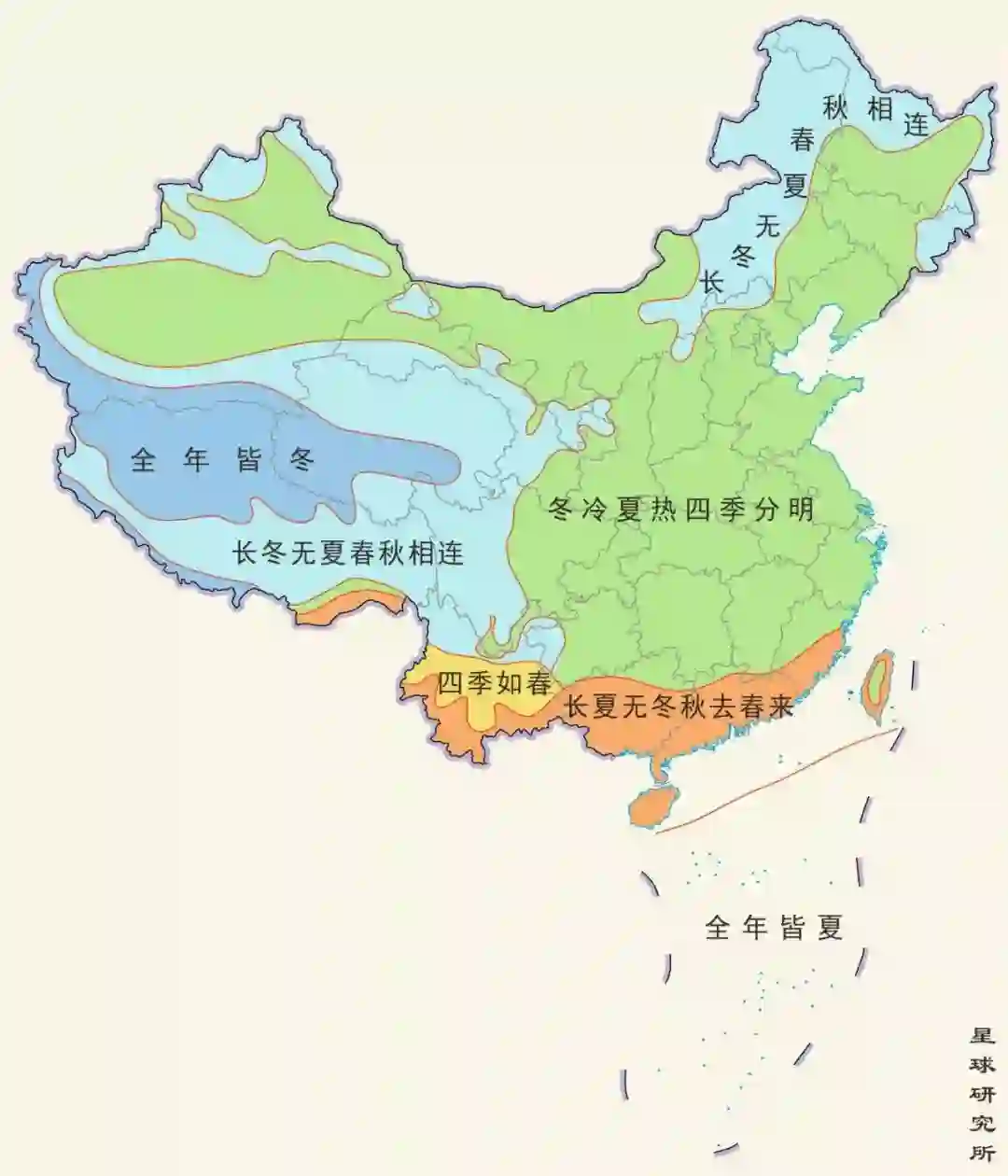 (中国四季类型分区,依据林之光《中国气候》,制图@王朝阳/星球研究所)