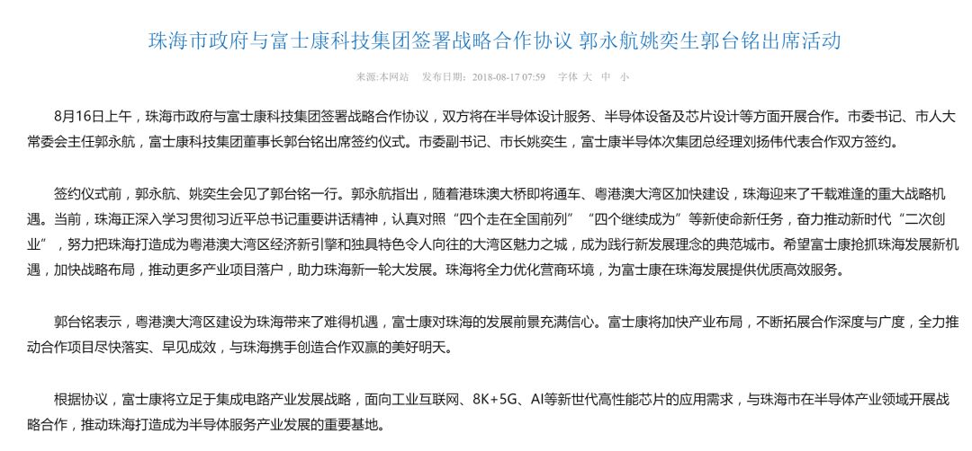 根据珠海市政府官网消息,8 月 16 日上午,珠海市政府与富士康科技集团签署了战略合作协议,双方将在半导体设计服务、半导体设备及芯片设计等方面开展合作。