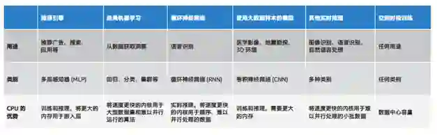 针对不同的业务,如推荐引擎、经典机器学习、循环神经网络,CPU有其不同的优势,