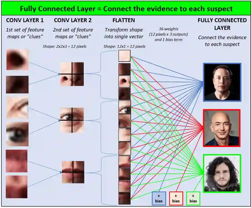 在全连接层中,我们将方方面面的证据连接起来。某种意义上,我们完成案件的拼图,向评审团表明证据和每个嫌疑人之间的联系: