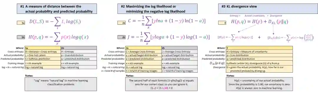 在监督学习分类问题的模型训练中,实际概率的不确定性总是等于0. 我们百分之百确定训练图像的分类无误。此时,最小化预测概率分布和实际概率分布之间的KL散度等价于最小化交叉熵。