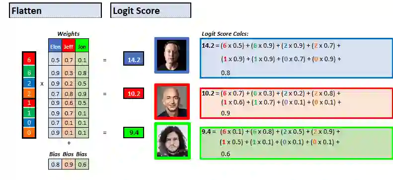 每片证据乘以连接证据至输出的权重。所有乘积相加,最后加上偏置项,得分最高的为模型的猜测。