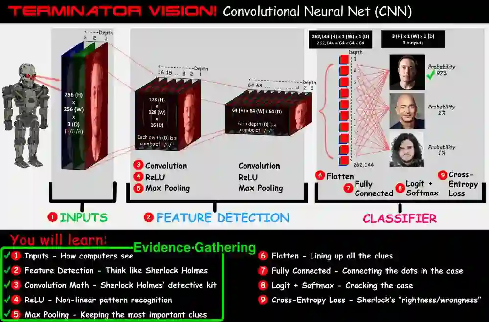 让我们假装终结者的头脑里住着一个特别的侦探,名叫“夏洛克·卷积·福尔摩斯”。他的工作是仔细查看证据(输入图像),使用敏锐的眼神和推理能力(特征检测),预测图像中的人是谁,从而破案(正确分类图像)。