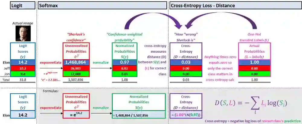距离捕捉了以下直觉:如果对正确标签的预测接近1,那么损失接近0. 如果对正确标签的预测接近0,那么将受到严厉的惩罚。目标是最小化正确分类的预测(Elon,0.97)和正确分类的实际概率(1.00)的距离。
