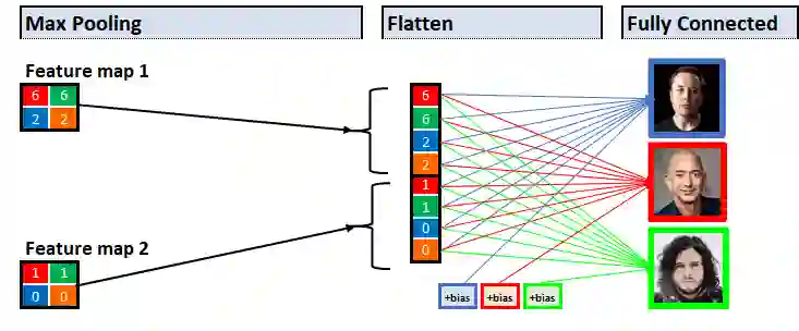 在扁平层的每份证据和3个输出之前是一组权重和偏置。类似网络中的其他权重,这些值会在刚开始训练CNN的时候随机初始化,而随着时间的推移,CNN将“学习”如何调整这些权重/偏置以得到更精确的预测。