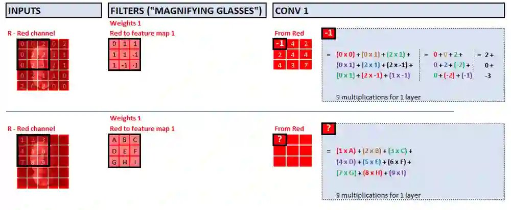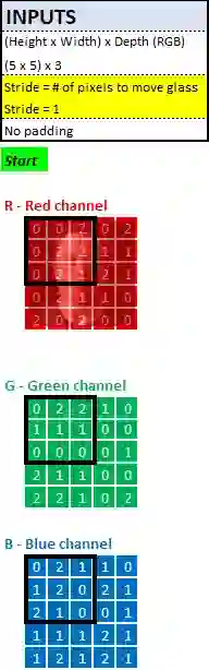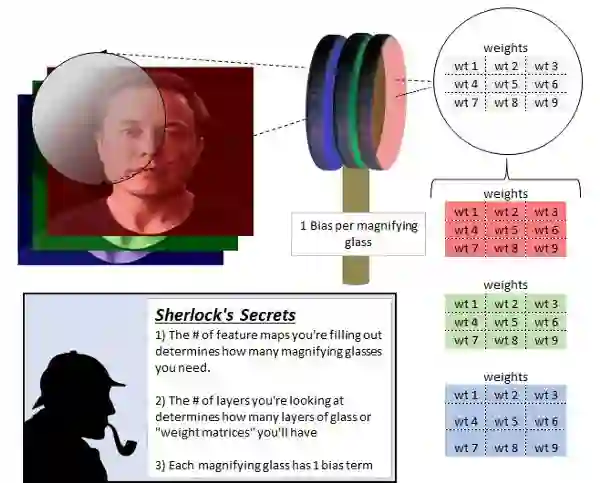 为了创建1个特征映射(一条线索),夏洛克从取出一个放大镜,并置于输入图像的左上角开始。红层玻璃只能看到红输入图像,绿层玻璃只能看到绿图,而蓝层玻璃只能看到蓝图。