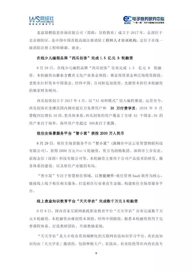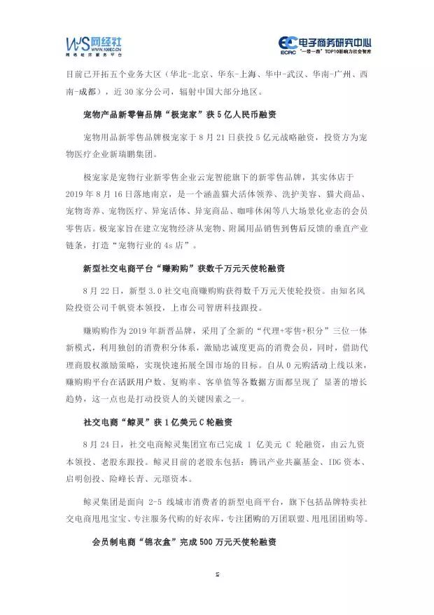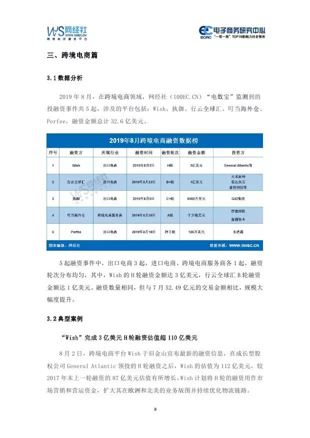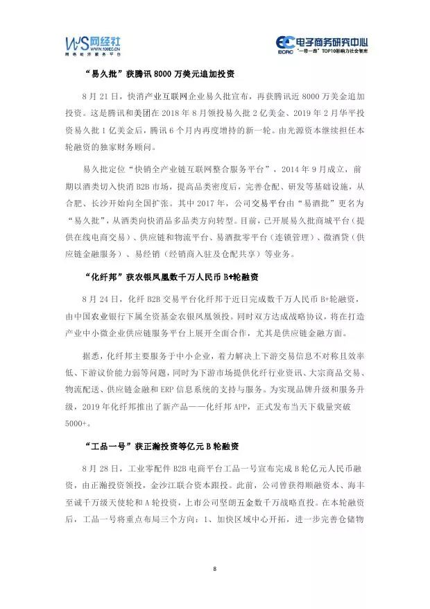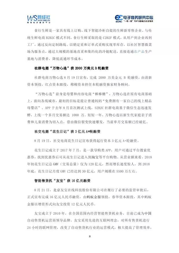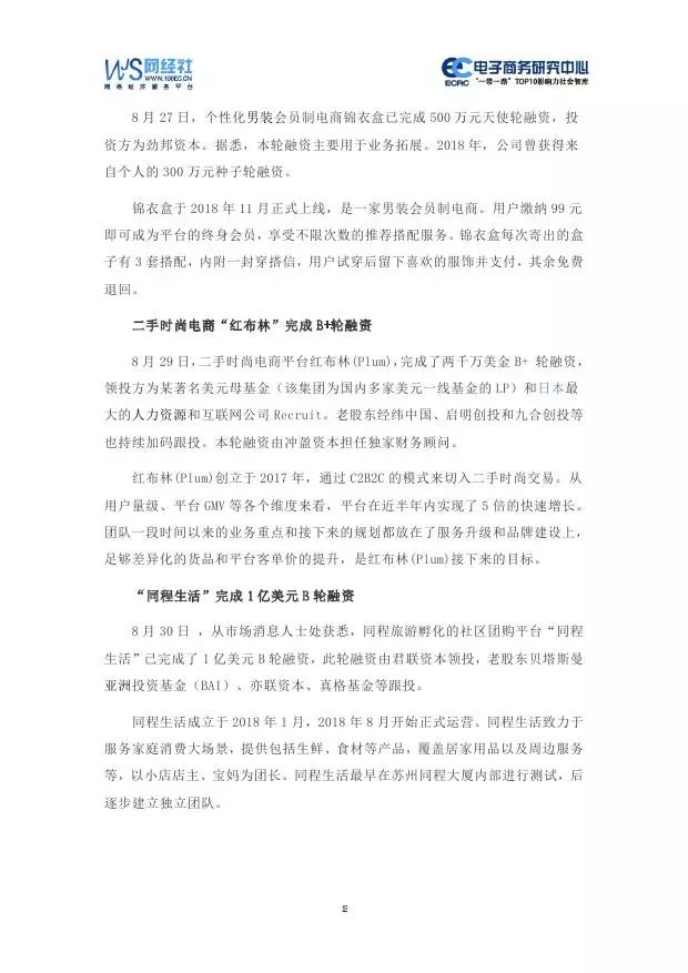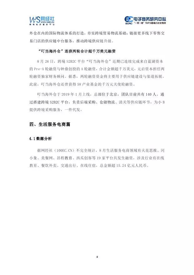 《报告》数据显示,8月中国电子商务行业共有47家企业获得了融资,融资总金额超203.47亿元。其中,B2B电商6起、零售电商11起、跨境电商5起、生活服务电商20起、物流科技5起。