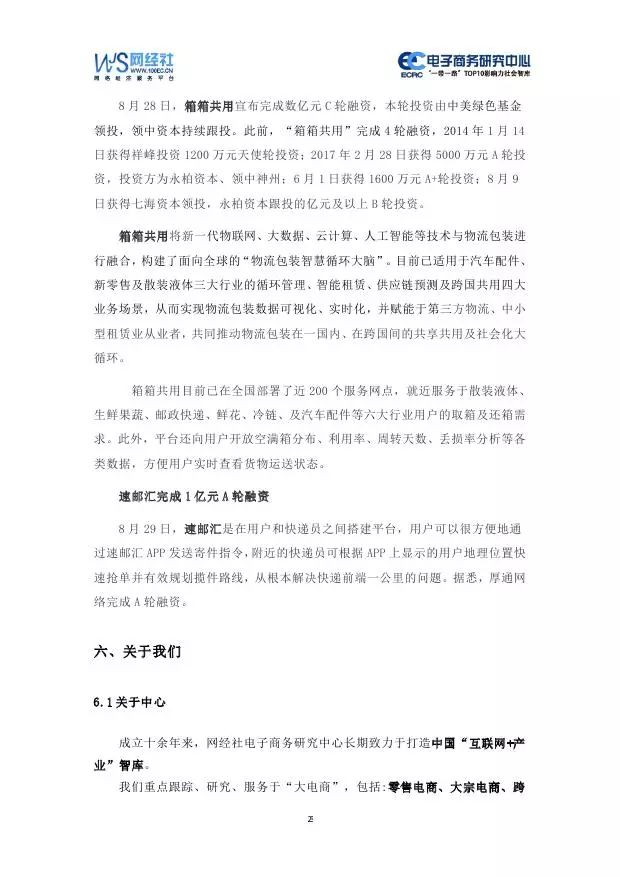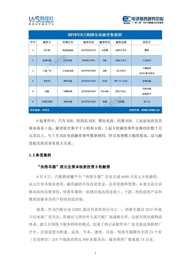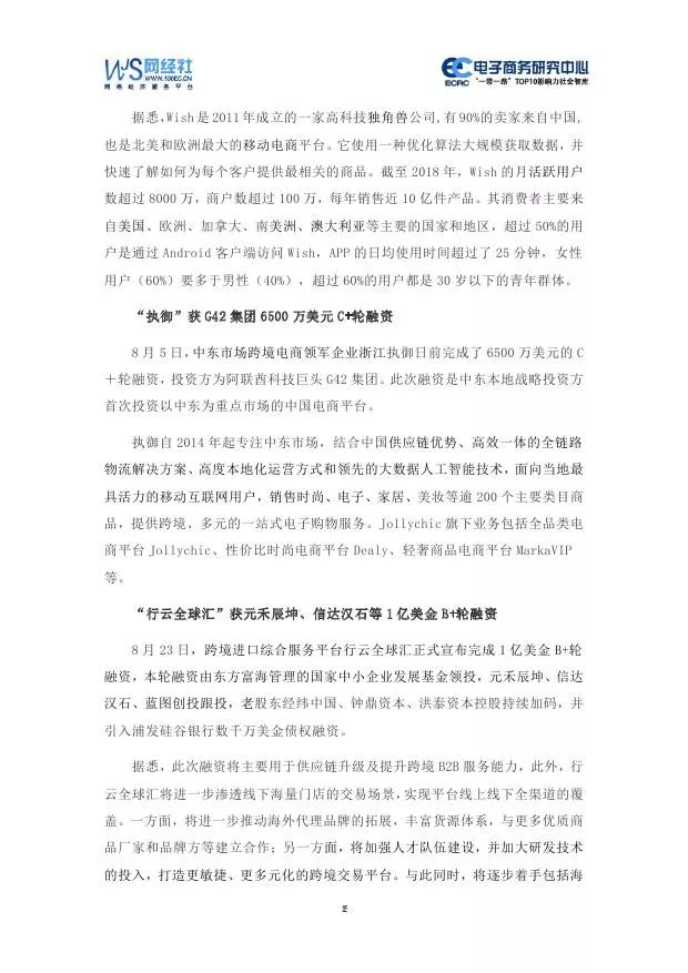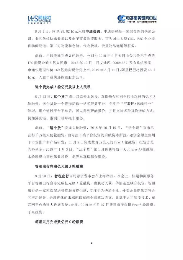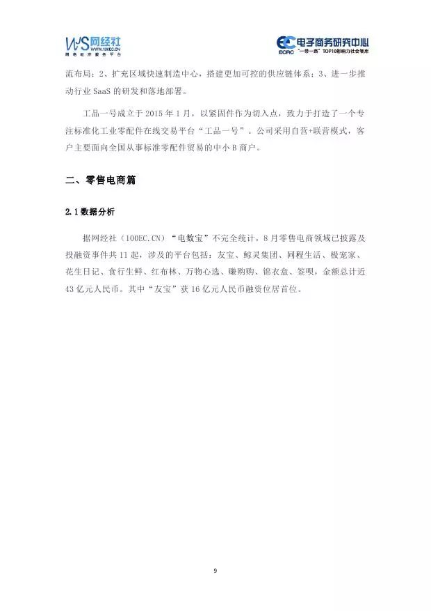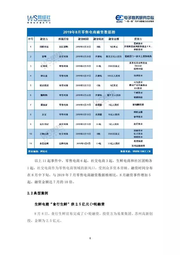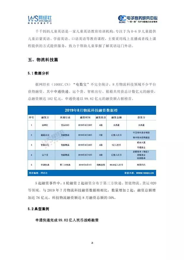 《报告》数据显示,8月中国电子商务行业共有47家企业获得了融资,融资总金额超203.47亿元。其中,B2B电商6起、零售电商11起、跨境电商5起、生活服务电商20起、物流科技5起。