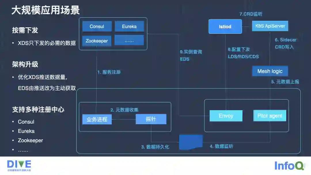 在这样一个场景里,我们做了一些事情,就是 XDS 在推送的时候,我们只下发必要的数据。这样的话,我们在十条数据里面,只精准地把一条数据或者两条 sidecar 所需要的数据推下去,sidecar 就能够主动地把数据加到自己执行的内存里面去运行,显著减小 Envoy 的性能损耗。