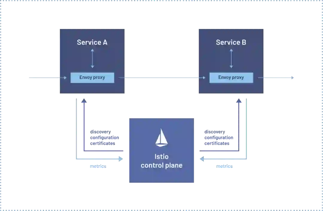 Service A 和 Service B 是我们的两个业务应用,Envoy Proxy 就是一个透明代理,它本身对业务是透明的。我们可以看到,有一个控制平面 Istio control plane,控制平面可以简单理解为,它会向着我们所有的 sidecar 去推送整体的一些配置、数据等等。通过这样一个典型的 Istio 架构,来引出我们这个服务网格的概念。