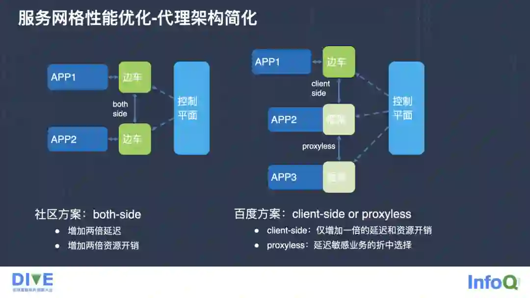 我们对此做了一定的优化。我们提供了 client-side 这样一个模式,和社区的方案对比来看,业务之间在通讯的时候,业务本身不再依托于边车的流量管理,也就是说,我们相当于仅增加一倍的延迟,而不是社区的两倍延迟。同时在资源效能开销方面又降低了很多,这是因为我们发现大部分的服务治理的能力是可以在客户端来实现的。