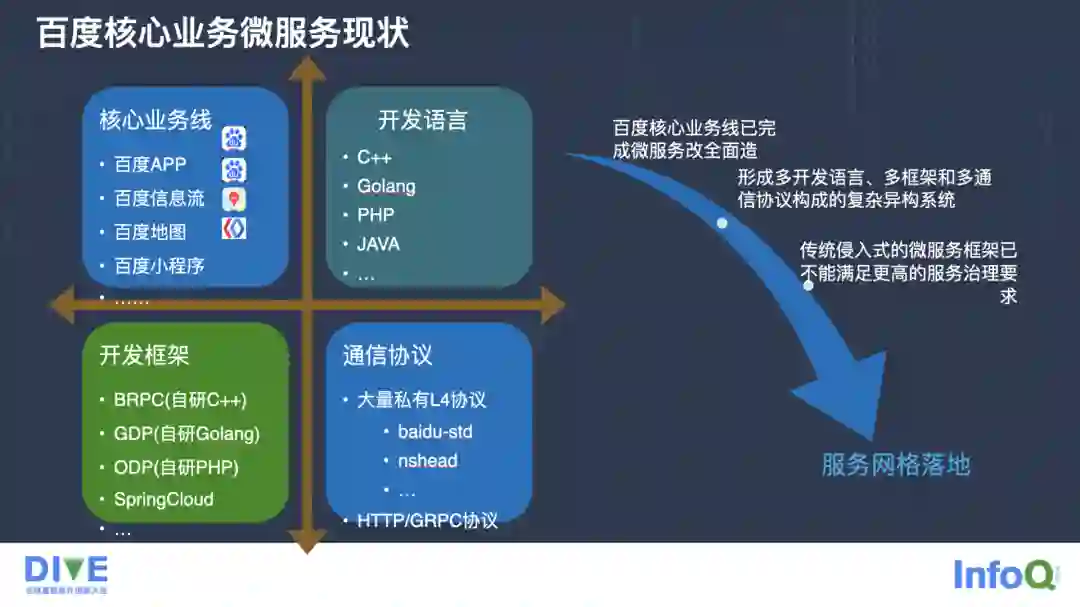 在业务线上,我们有很多核心业务线,比如百度 APP、信息流、地图,还有百度小程序。百度也有很多开发语言,比如 C++、Golang、PHP、Java 等等,形成了一个多语言的场景。在开发框架里,基于传统的微服务框架,我们也有很多内部实现的积累,比较有名的是 BRPC 框架,还有 Golang 的 GDP,PHP 的 ODP 都有一些实践,并且跟业界开源的 SpringCloud 也有一些落地实践。
