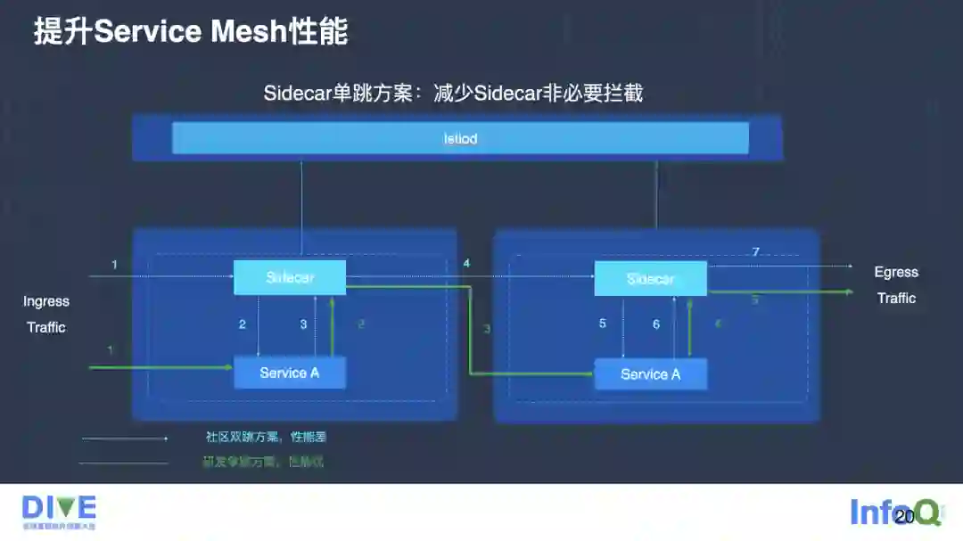 先来看一下社区的方案。社区的方案是一个典型的双跳方案,每个业务程序都有一个边车,所有的流量都要经过两次边车处理,它有一个两倍的延时,包括两倍的资源开销。