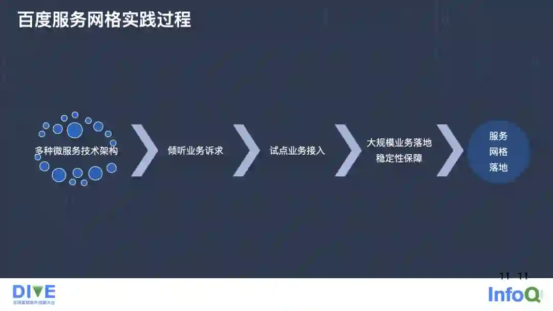 百度已经形成了很多微服务技术框架和架构,我们要去做一个新技术的推广,包括服务网格的落地,首先要去倾听业务的诉求。基于这些业务诉求,选择一些比较典型的核心业务,然后逐步向服务网格这样一个全新的微服务架构去转型。最后我们实现了比较大规模的业务落地,包括我们在大规模场景下一些稳定性相关的保障。