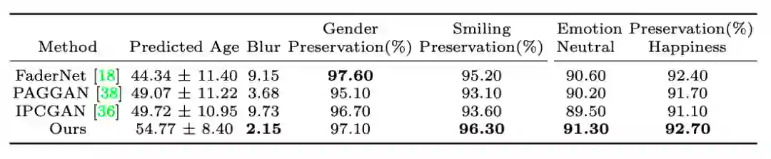 数据集为online face recognition API ,生成的是50岁以上的效果,可见该文方法年龄结果在50岁以上,生成图像最清晰,在表情保留方面更好,性别保留方面略差。