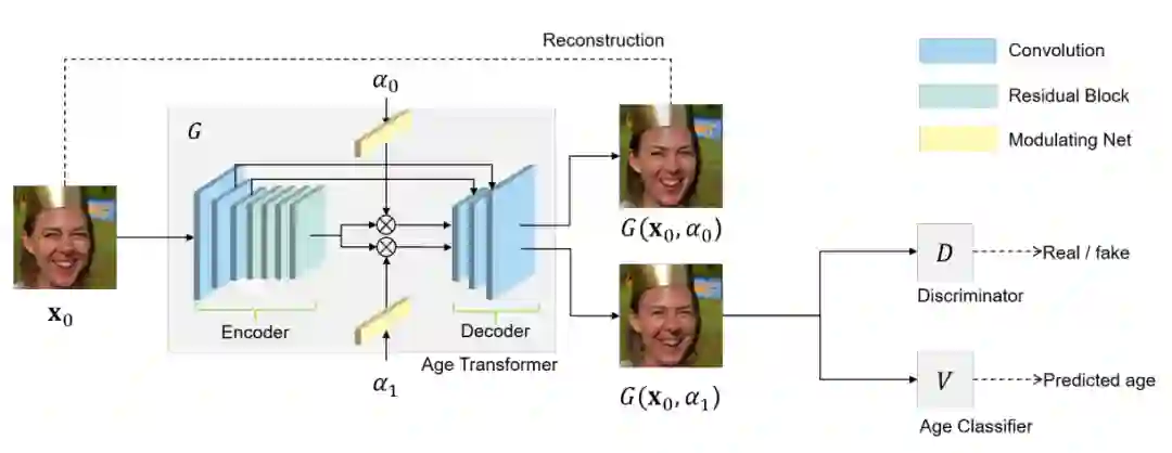 上图是该文算法的训练过程。给定输入人脸图像X0和对应年龄a0,想要生成的人物年龄a1。输入图像经过一个编码器、调制网络(图中黄色模块)、解码器进行图像重建,编码器是为了得到人脸的年龄无关表示,调制网络把年龄编码成128维向量,调制每一个编码后的特征通道,加入年龄特征。
