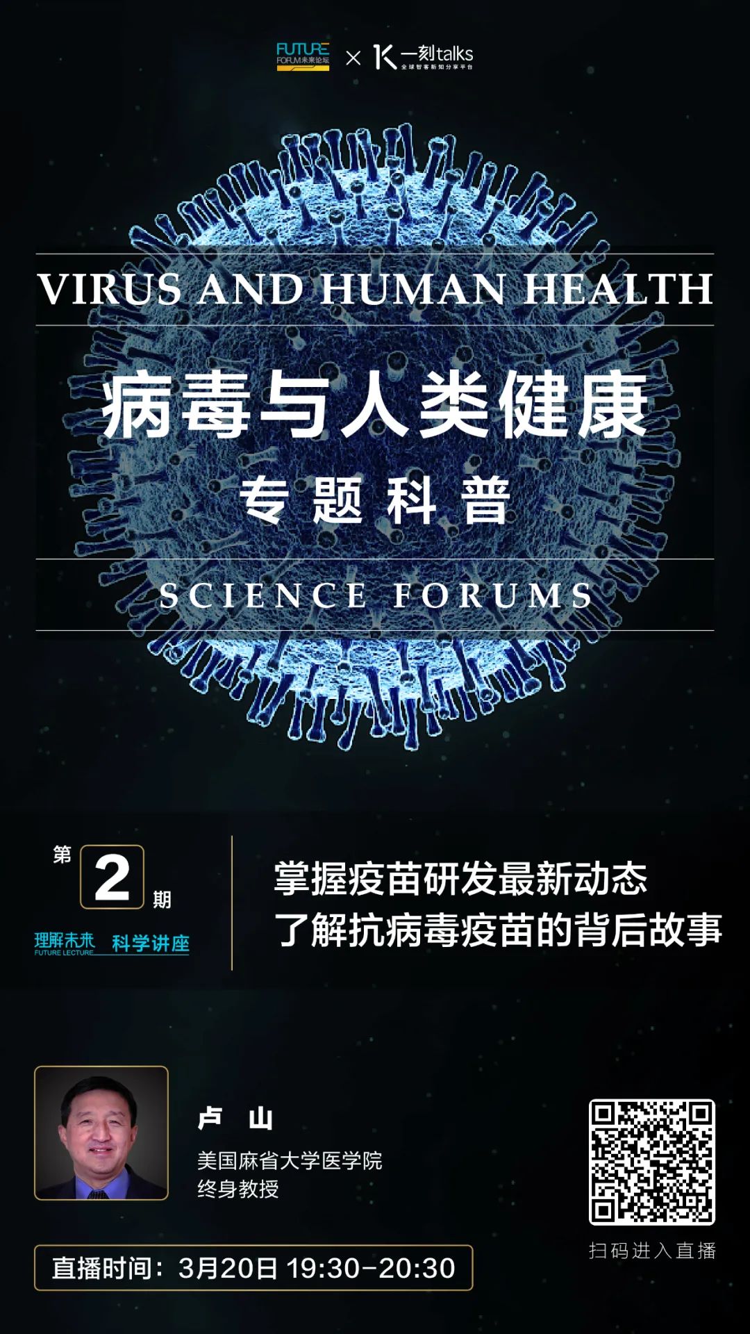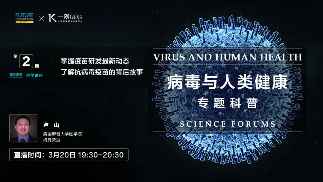 在今晚(3月20日19:30),美国麻省大学医学院卢山教授将为我们带来《掌握疫苗研发最新动态,了解抗病毒疫苗的背后故事》的主题分享。