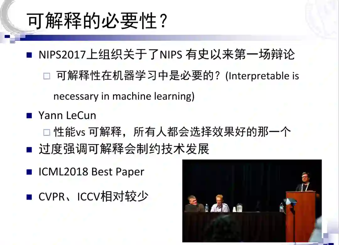 首先是为什么做可解释。刚才林老师也谈到了,NeurIPS2017上组织过一次辩论,就是关于可解释对机器学习的必要性,当时深度学习的三巨头之一LeCun教授的观点非常明确,在性能和可解释之间多数人都会把性能作为优先的选项。但是,ICML 2018的Best Paper颁给了可解释的研究,然后最近IJCAI,AAAI也都组织过相关的研讨会,说明可解释学习已经引起了学术界的广泛关注。