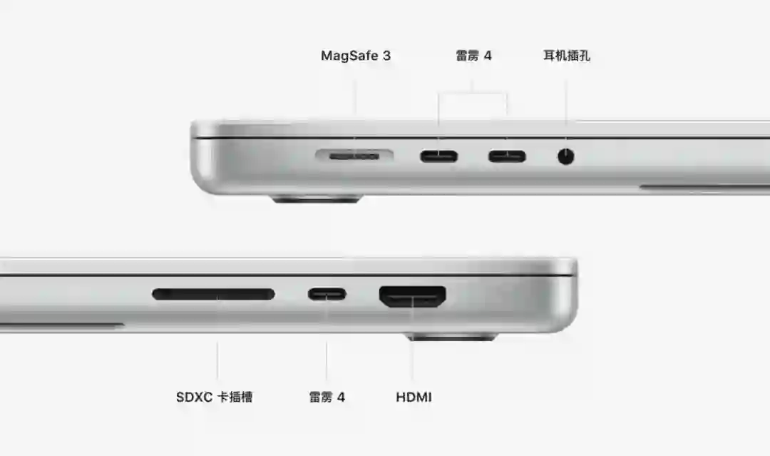 除了新芯片,新一代 Macbook Pro 各方面也是全面升级。2016 年以来首次的模具完全更新;一块内置 10000 颗 mini-LED 灯珠的 ProMotion 自适应刷新率屏幕;3 个雷雳 4 接口、1 个 HDMI 接口、1 个 SDXC 卡插槽、1 个 3.5mm 耳机接口,充电接口则回归了 MagSafe 连接方式。最高 64 GB 的带宽,让 M1 Max 芯片机型支持连接 3 台 Pro Display XDR 显示器加一台 4K 电视。如此配置,专业人士怎能不爱。