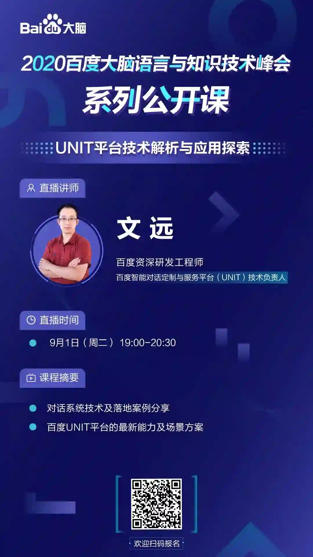 2020百度大脑语言与知识技术峰会已在8月25日举办。9月1日晚7:00-8:30,峰会第四节系列公开课《UNIT平台技术解析与应用探索》将对百度智能对话定制与服务平台UNIT的技术及目前已落地案例进行分享,此外还将对百度UNIT的最新能力和场景方案进行解读。课程将在百度APP、CSDN、B站等平台同步直播,扫描下方海报中的二维码即可免费报名!